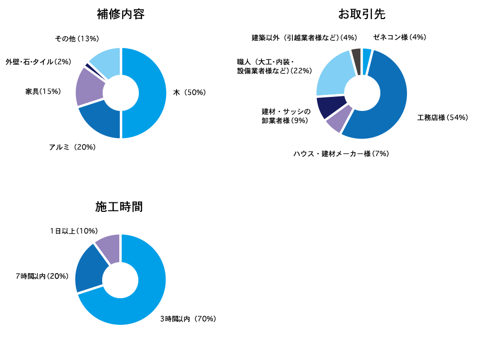おかげさまで創業以来、多くの補修のご依頼をいただいており、実績の数は20000件を超えています。他にはない圧倒的な実績件数は当社の誇りであり、信頼の証と言えます。