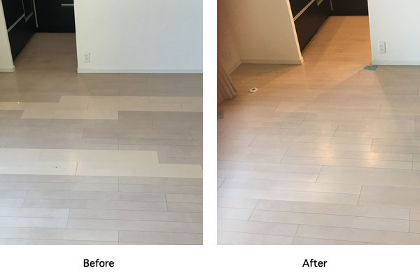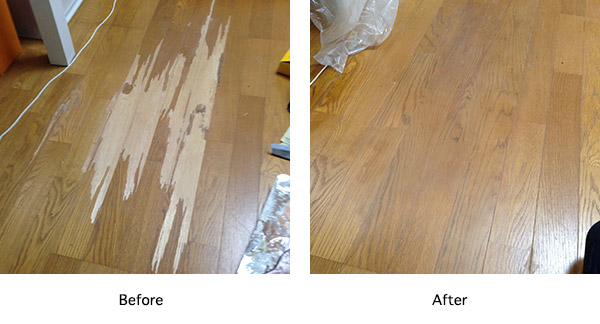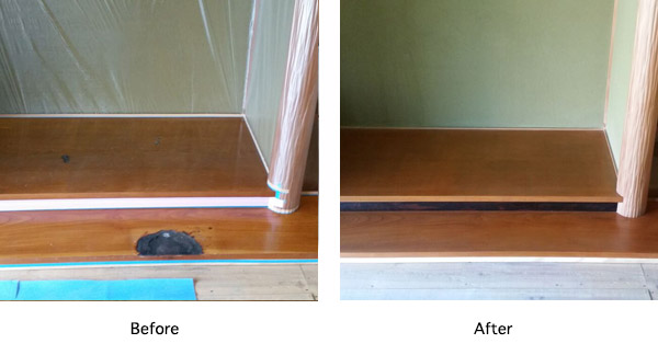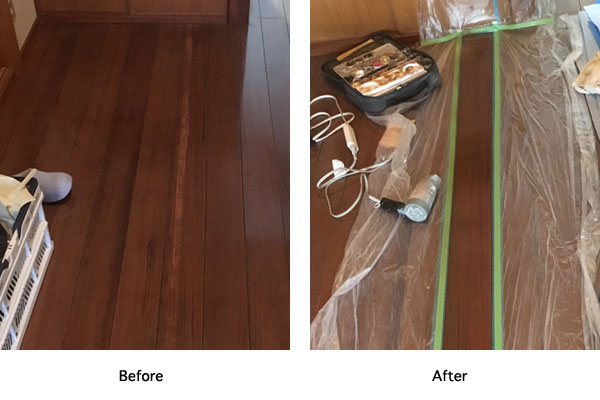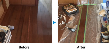 退去後のメンテナンスで部分的に床を張り替えたため、色が合わないのをなじませてほしいとのご依頼でした。